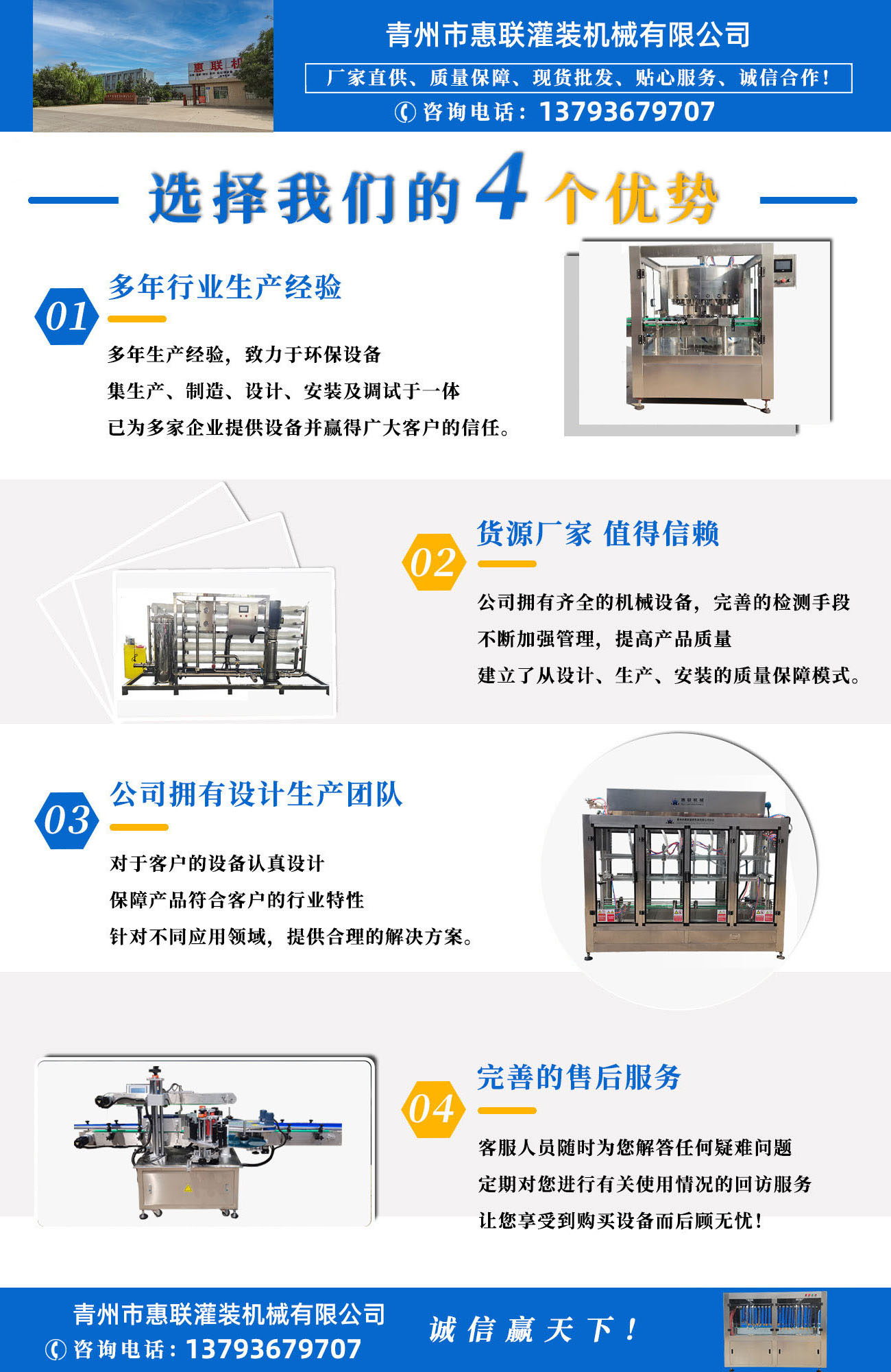 青州市惠聯(lián)灌裝機(jī)械有限公司是一家集生產(chǎn)研發(fā)、銷售、服務(wù)于一體的液體灌裝成套設(shè)備生產(chǎn)企業(yè),可根據(jù)廠家要求設(shè)計(jì)合理液體灌裝生產(chǎn)線,為用戶提供技術(shù)咨詢、設(shè)計(jì)工藝、場(chǎng)區(qū)平面布置、工藝改造、設(shè)備安裝調(diào)試等完善服務(wù)。 公司生產(chǎn)制造各種類型液體灌裝機(jī)、過濾機(jī),水處理設(shè)備及液體灌裝成套設(shè)備。主要產(chǎn)品有:白酒、葡萄酒、黃酒等酒水灌裝機(jī)、食用油、機(jī)油、潤(rùn)滑油等油類灌裝機(jī)、醬油醋、老抽、生抽等調(diào)味品灌裝機(jī)、防凍液、玻璃水灌裝機(jī)、酒精、84消毒液灌裝機(jī)、車用尿素灌裝機(jī)、口服液灌裝機(jī)、洗滌劑灌裝機(jī)等多種液體、膏體灌裝設(shè)備,全自動(dòng)/半自動(dòng)灌裝機(jī)型號(hào)多,規(guī)格全,洗瓶機(jī)、瓶子封口機(jī)、打塞機(jī)、熱縮機(jī)、瓶子烘干機(jī)、貼標(biāo)機(jī)、噴碼機(jī)、輸送線、裝箱機(jī)、水處理設(shè)備等全套生產(chǎn)線相關(guān)配套設(shè)備齊全,自產(chǎn)自銷,一站式購(gòu)齊,售后無憂。